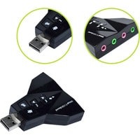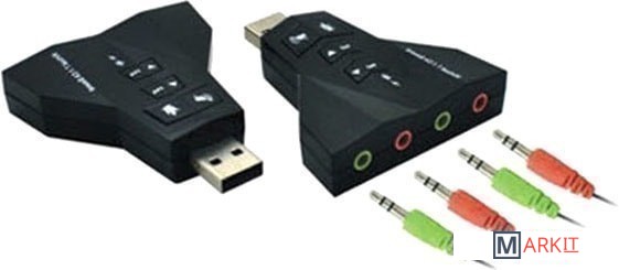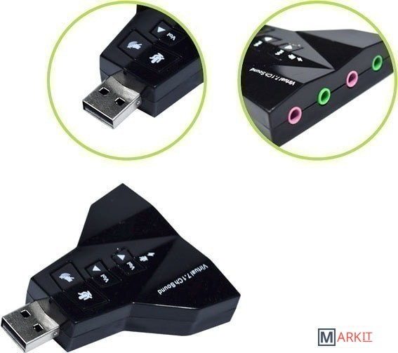 Внешняя звуковая карта USB 3D 2.1/7.1-канальная предназначена для подключения динамиков, колонок, наушников или микрофона через порт USB компьютера или ноутбука. Если у Вас не работает системная звуковая карта, некачественный звук или Вас не устраивает базовая громкость Ваших динамиков или в Вашей технике отсутствует порт jack 3.5mm, либо Вам необходимо подключить гарнитуру с микрофоном или отдельно микрофон, данный адаптер будет отличным решением данной задачи. Встроенные кнопки дают возможность увеличить громкость или вообще ее отключить, также можно отключить микрофон. Оригинальный дизайн в форме самолета и два выхода для наушников и микрофонов. Не предназначена для телевизора. Не требует установки драйвера.Характеристики:– Встроенные кнопки дают возможность увеличить/уменьшить громкость или вообще ее отключить, также можно отключить микрофон.– Поддержка колонок или наушников, функция записи микрофона; функция свободного переключения между режимами наушников и динамика.– Поддержка файлов формата WAV/MP3/WMA/MPEG1 (VCD)/MPEG2 (SVCD)/AVI/DVD_Audio/DVD_AC3/DVD_DTS/DiVX.– Технология Xear 3D полностью поддерживает функции MS DirectX, EAX1.0/2.0, HRTF 3DX.– Технология мультиплексирования для достижения 7.1-канального динамического звука.– Поддержка трехмерного звука и виртуального 7.1-канальный.– Функция микшера.– 16 предустановленных ритмических режимов.– 23 предустановленных режима звукового поля.– Преобразует аналоговый сигнал (микрофон и линейный сигнал CD, MP3, TV, радио и т.д.) в цифровой сигнал.– Интерфейс USB2.0, адаптер совместим с интерфейсом USB3.0 и обратно совместим с версией USB1.1. Скорость передачи данных: 12 Мбит/с.– Максимальная стерео-частота ЦАП: 96 кГц.– Соотношение шум/сигнал: 90 Дб.– Автоматическая регулировка уровня выходного сигнала.– Световой LED индикатор показывает рабочее состояние адаптера.– Не требуется установки драйвера.– Поддержка всех ОС: Windows 2000/XP/Server 2003/VISTA 7/8/10, Linux, Mac OS и др.